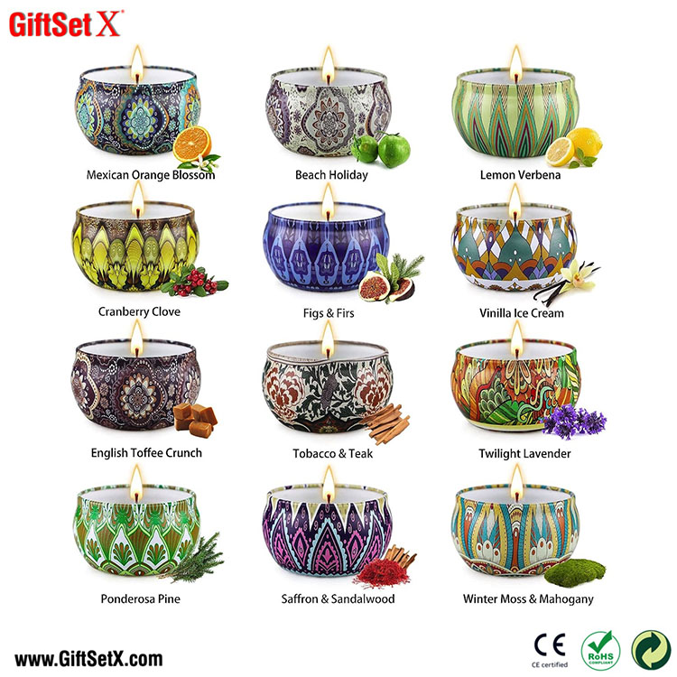 Duftlys gavesett - inneholder 12 dufter: Bergamot, Campfire Marshmallow, eplekanel, einer og lavendel, appelsin ingefær, mangomandel, jasmin, hav, mahogniteak, salvie, lavendel, sandeltre.